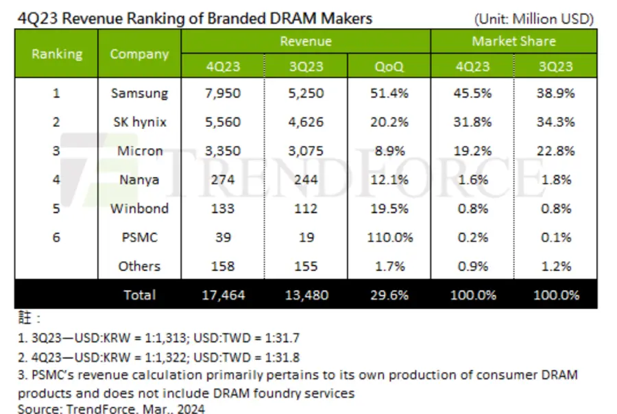 2위인 SK하이닉스는 출하량이 1~3% 소폭 증가했지만 HBM과 DDR5, 특히 고밀도 서버용 D램 모듈의 가격 우위로 인해 ASP가 17~19% 증가해 전분기 대비 20.2% 증가한 55억6000만달러를 기록했다. 3위 마이크론은 생산량과 가격 모두에서 각각 4~6% 증가해 전분기 대비 8.9% 증가한 33억5000만달러를 기록했다.