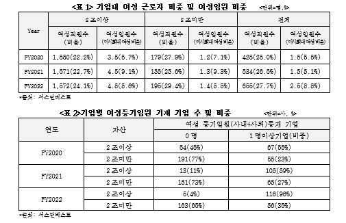 미세하지만 성평등 지표의 개선추세도 감지되고 있다. 자산규모 2조이상 기업의 여성 직원 비율은 2020년 22.2%에서 2022년 24.1%로 1.9%p 늘어났고 2조 미만 기업의 경우도 27.9%에서 29.4%로 1.5%p늘어나 여성인력의 비중이 꾸준히 늘고 있음을 보여줬다. 또 이사회 내 여성 임원의 비중도 2조이상기업의 경우 5.7%에서 8.6%로, 2조 이하 기업의 경우도 7.1%에서 8.8%로 늘어나는 등 미미하지만 추세적 개선은 이뤄지고 있는 것으로 파악됐다.