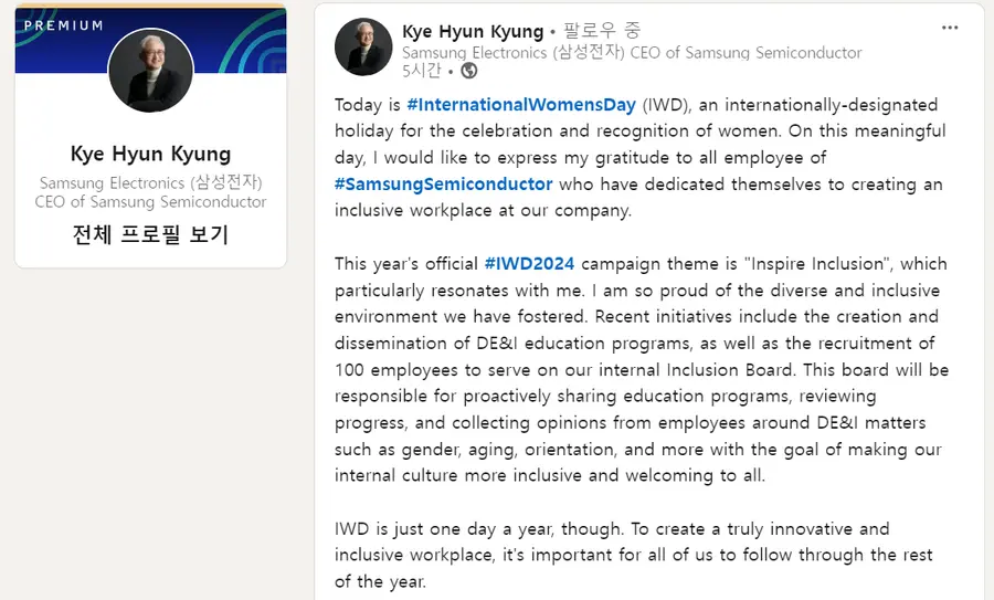 경 사장은 "오늘은 세계 여성의 날(IWD)로, 여성을 기념하고 인정하기 위해 국제적으로 지정된 기념일"이라며 "뜻깊은 날을 맞아 포용적인 직장 조성을 위해 헌신한 삼성 반도체 임직원 여러분께 감사의 말을 전한다"고 말했다.