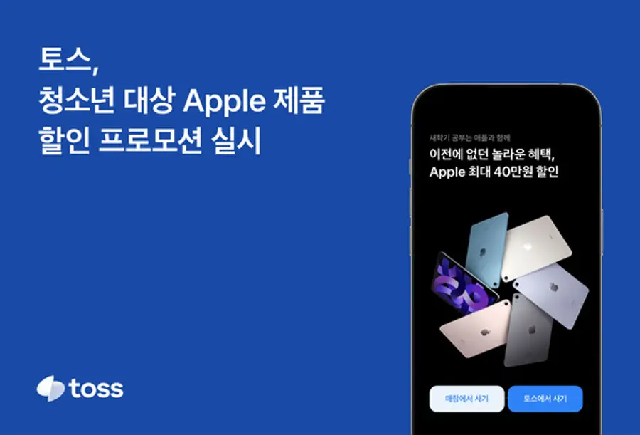 2005년생부터 2008년생까지의 토스 회원들은 Apple의 MacBook Air(13 M1 모델), iPad Air 5세대(Wi-Fi 모델) 및 Apple Pencil (2세대)을 할인된 가격에 구매할 수 있다. 최대 할인 금액은 40만원으로, 행사는 오는 30일까지 진행된다.