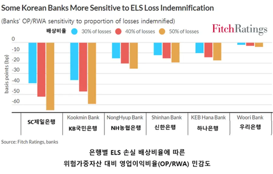 대형 은행의 위험가중자산 대비 영업이익비율(OP/RWA)은 올해 3~47bp (0.03~0.47%p) 하락할 것으로 예상했다. 피치는 "사업 규모에 비해 상대적으로 더 많은 ELS를 판매한 은행들은 더 큰 타격을 입을 수 있다"고 우려했다.