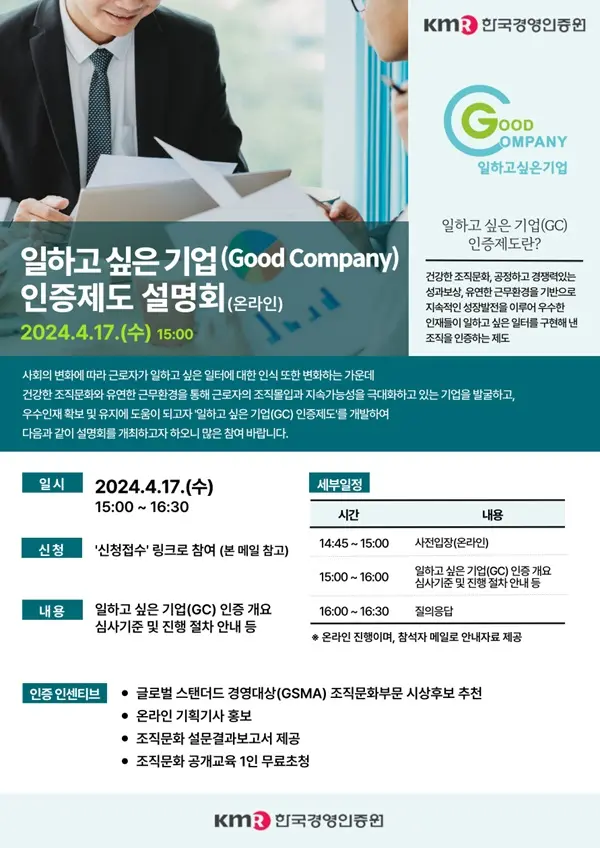 한국경영인증원(KMR)은 오는 4월 17일 ‘일하고 싶은 기업(Good Company, GC) 인증제도 설명회’를 개최한다고 18일 밝혔다.