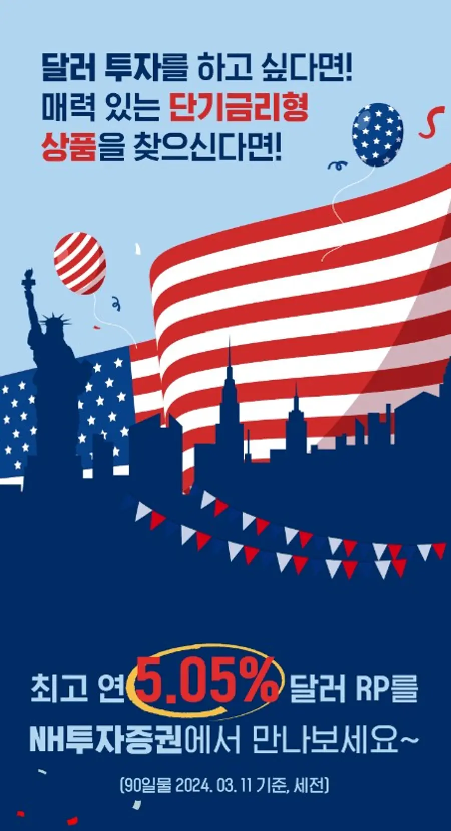 NH투자증권은 미국 달러화 RP(약정형)를 가입하는 고객에게 최고 5.05%(이하 연, 세전) 특판금리를 제공하는 이벤트를 진행한다고 18일 밝혔다.