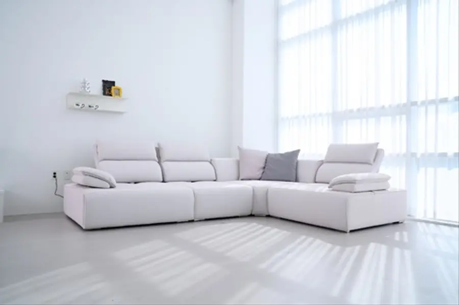 소파 마감 소재인 폴라리스 패브릭은, 부드러운 터치감과 스크레치에 강한 견고한 내구성이 특징이다. 소재 표면에 액체가 바로 스며들지 않는 발수 및 생활 방수 기능으로 내장재 오염 없이 위생적인 관리와 손쉬운 청소가 가능하다.