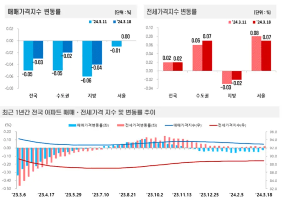 한국부동산원이 발표한 3월 셋째주(18일 기준) 전국 주간 아파트가격 동향 조사에 따르면 전국 아파트 매매가격은 0.03% 하락하며 전주(-0.05%)대비 하락폭이 축소됐다.