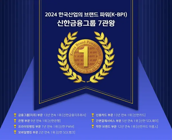 신한금융그룹은 25일 한국능률협회컨설팅(KMAC)에서 주관하는 2024 한국산업의 브랜드 파워(K-BPI) 조사에서 신한금융지주, 신한은행, 신한카드 등 3사가 7개 분야에서 1위 브랜드로 선정됐다고 밝혔다.