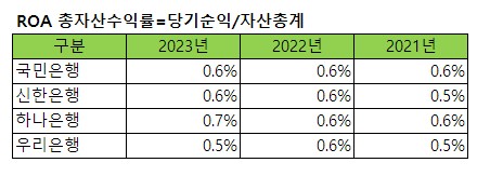 당기순이익을 총자산으로 나눈 총자산수익률(ROA)에서도 우리은행은 경쟁사 대비 0.1~0.2%p 뒤처진 것으로 나타났다. 지난해 당기순이익 1위를 기록한 하나은행의 ROA가 0.7%를 기록한 반면, 우리은행의 ROA는 0.5%에 그쳤다. 국민과 신한은행의 ROA는 0.6%로 엇비슷했다.