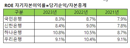 또다른 수익성 지표인 ROE(자기자본이익률)에서도 우리은행의 ROE 하락폭이 경쟁사 대비 상대적으로 높았다.