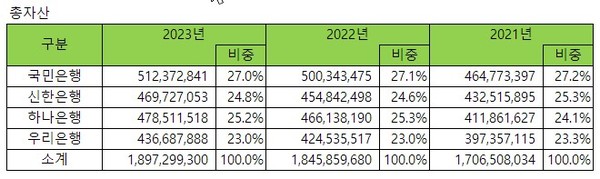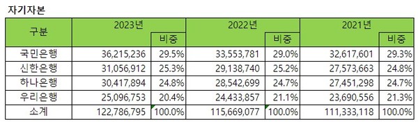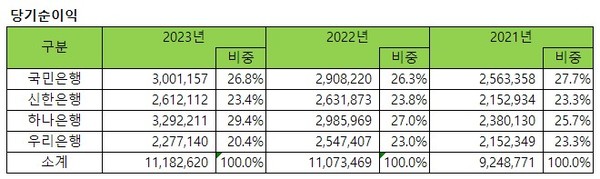이들 4대 시중은행이 지난해 거둔 전체 당기순익은 11조1826억원으로, 1% 증가했다. 하나은행의 당기순이익이 3조2922억원으로 점유율 29.4%를 기록했고, 이어 국민은행 26.8%(3조11억원), 신한은행 23.4%(2조6121억원), 우리은행 20.4%(2조2771억원)을 기록했다.