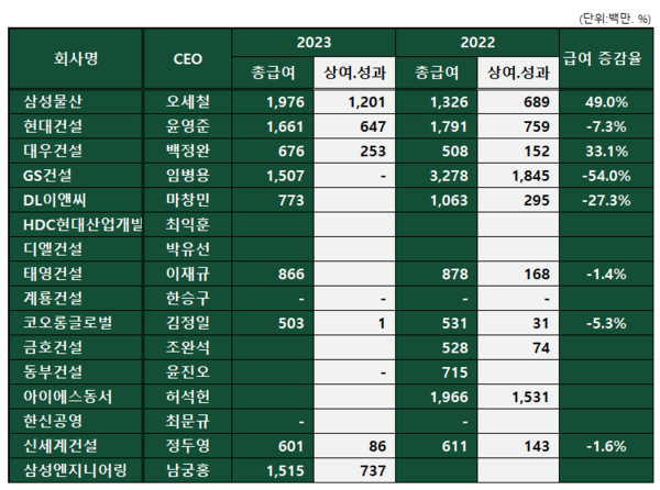 27일 금감원 전자공시에 공개된 주요 건설사 ‘2023년 사업보고서’ 중 임원 보수를 분석한 결과, 건설사 CEO 중 가장 많은 연봉을 받은 사람은 삼성물산 오세철 대표이사였다. 오 대표는 지난해 19억 7600만원의 보수를 받아 2022년 연봉 13억2600만원에서 6억5000만원 올랐다. 상여가 큰 폭으로 오르면서 연봉이 50% 가까이 늘었다.