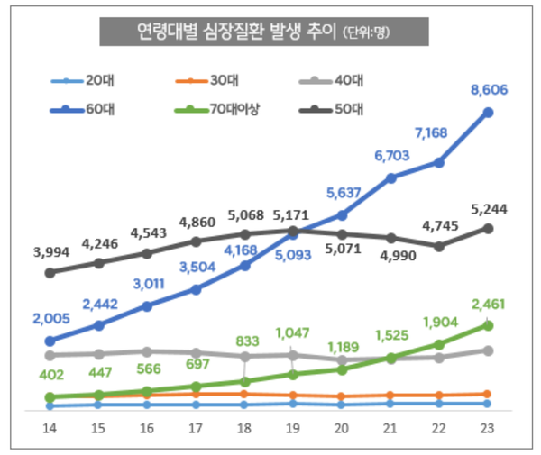 60대 이상이 증가세를 주도했다. 뇌혈관질환 중 가장 발병빈도가 높은 질병은 뇌경색증으로 나타났다. 60대 뇌경색증 발병 건수는 2014년 1349명에서 2023년 3302명으로 2.4배 증가했다. 같은 기간 70대는 447명에서 1499명으로, 3배 넘게 늘었다.