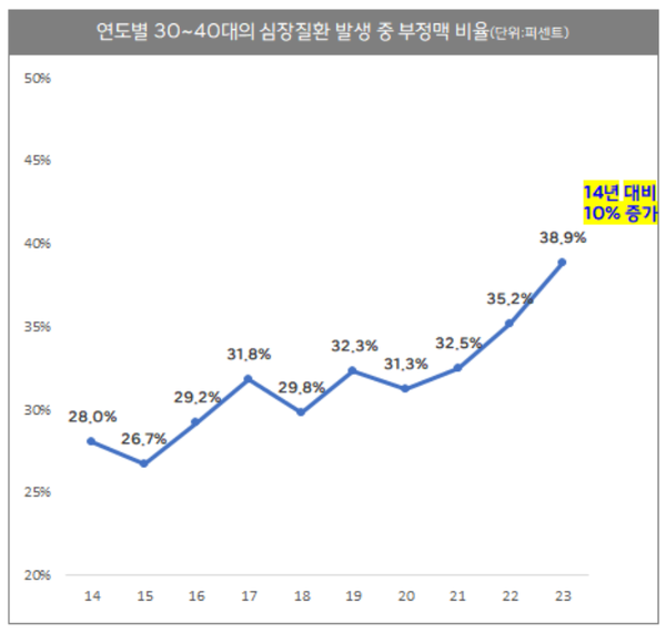 반면 30~40대가 조심해야 할 심장질환은 부정맥이다. 부정맥은 모든 연령대에서 발생이 증가하는 추세인데, 30~40대의 발병 비중이 높은 편이다.
