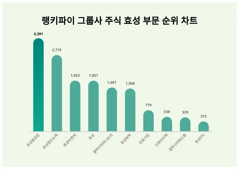 랭키파이 3월 4주차 그룹사 주식 효성 부문 트렌드 지수에서 효성중공업이 트렌드 지수 3,391포인트로 1위에 올랐다.