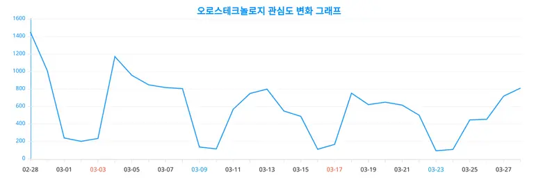 이번 분석을 통해 얻어진 오로스테크놀로지에 대한 일간 변화 추이 차트는, 오로스테크놀로지에 대한 관심이 어떻게 변화했는지를 생생하게 드러낸다.