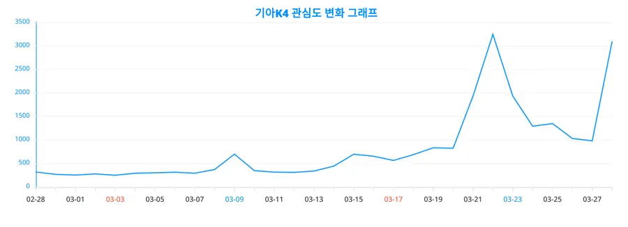 이번 분석을 통해 얻어진 기아K4에 대한 일간 변화 추이 차트는, 기아K4에 대한 관심이 어떻게 변화했는지를 생생하게 드러낸다.