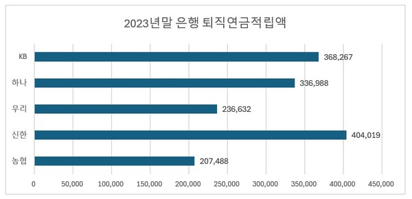 1일 은행연합회에 따르면, 작년 말 KB국민은행, 신한은행, 하나은행, 우리은행, NH농협은행 등 5대 시중은행의 퇴직연금 누적적립액 규모는 155조3394억원을 기록했다. 지난 2022년말 대비 1년 사이 23조1047억원이 증가했다.