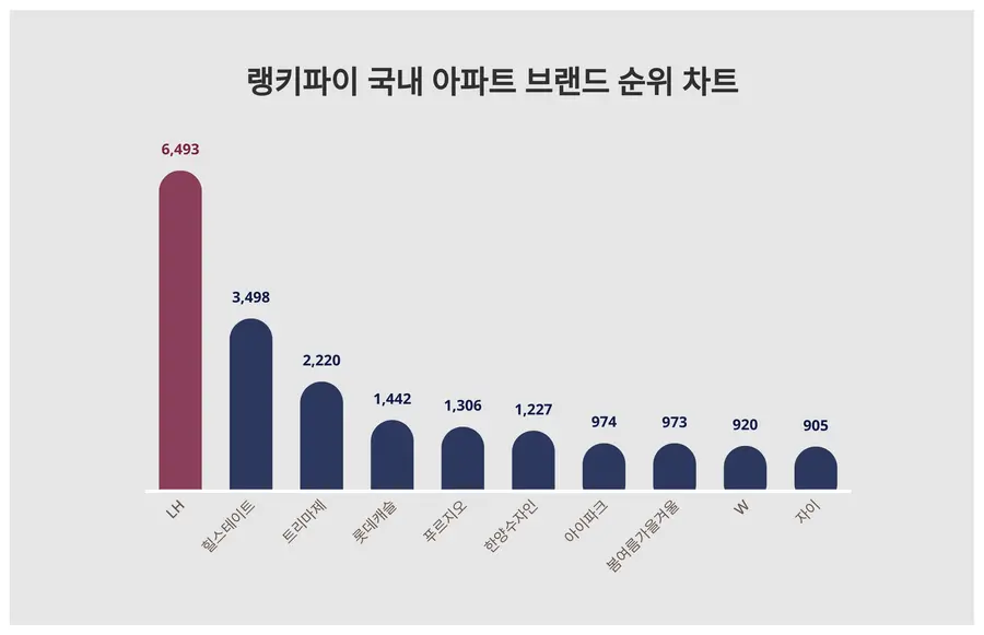 LH가 트렌드 지수 6,493포인트로 랭키파이 4월 1주차 국내 아파트 브랜드 트렌드 지수에서 1위에 올랐다.