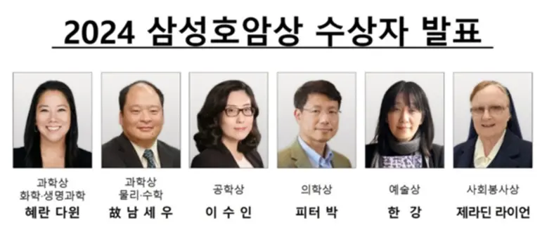 올해 수상자는 ▲과학상 화학∙생명과학부문 혜란 다윈(55) 美 뉴욕대 교수 ▲과학상 물리∙수학부문 故 남세우(54) 美 국립표준기술연구소 연구원 ▲공학상 이수인(44) 美 워싱턴대 교수 ▲의학상 피터 박(53) 美 하버드의대 교수 ▲예술상 한강(54) 소설가 ▲사회봉사상 제라딘 라이언 수녀(76) 등 6명이다.