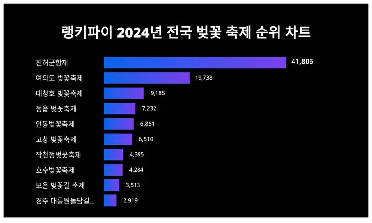 | 10 | 경주 대릉원돌담길 벚꽃축제 | 2,919 | 1,846 | 1,073 | 58.1% |