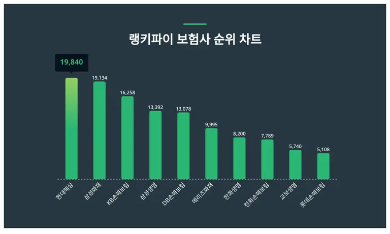 현대해상이 트렌드 지수 19,840포인트로 랭키파이 4월 1주차 보험사 트렌드 지수에서 1위에 올랐다.