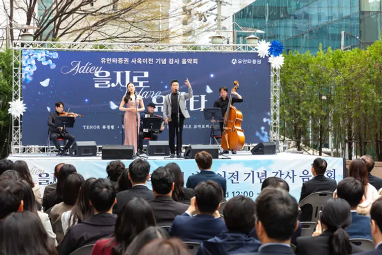 유안타증권이 지난 3일 을지로 본사 2층 야외 주차장에 마련한 특별 무대에서 임직원들과 을지로 인근 직장인 및 지역주민들께 감사의 마음을 전하는 '아듀(Adieu) 을지로, 볼라레(Volare) 유안타' 음악회를 개최했다.