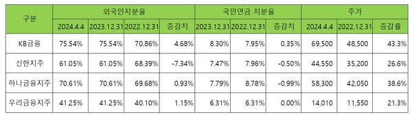 갑진년이 4분의 1 흐른 최근에도 이들 금융지주사의 외국인 지분율은 작년 말 수치 그대로다.