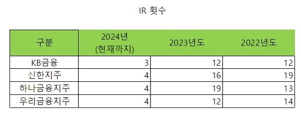 한국거래소에 따르면, 신한지주는 지난해 국내외IR를 16차례 가졌다. 코로나19 그늘에서 벗어난 2022년 19차례 투자자를 만난 것과 비교하면 줄어든 수치다. 다만 맞수인 KB금융의 IR횟수 12번보다 더 많았다. 이 기간 하나금융지주와 우리금융지주는 각각 19회와 12회씩 IR행사를 가졌다.