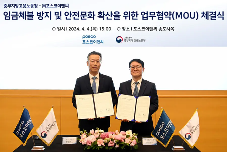포스코이앤씨(대표이사 사장 전중선)가 4일 인천 포스코이앤씨 송도사옥에서 고용노동부 중부지방고용노동청과 `건설근로자 임금체불 방지 및 안전문화 확산`을 위한 업무 협약식을 체결했다.