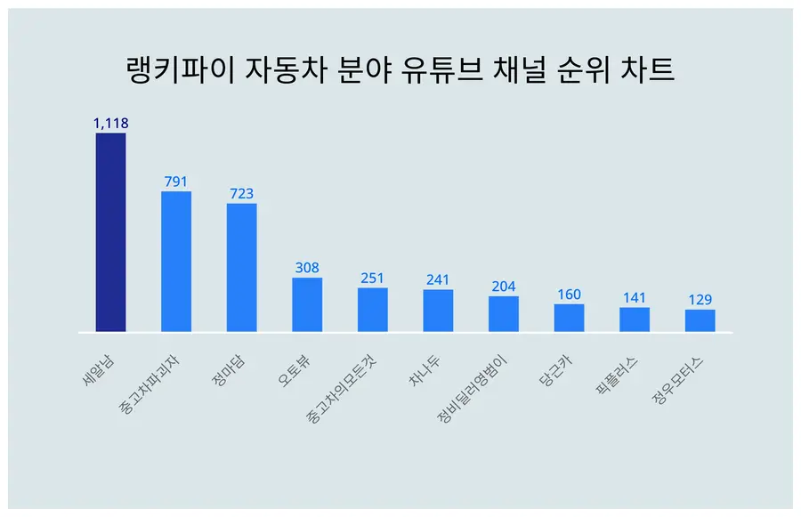 세알남이 트렌드 지수 1,118포인트로 랭키파이 4월 2주차 자동차 분야 유튜브 채널 트렌드 지수에서 1위에 올랐다.