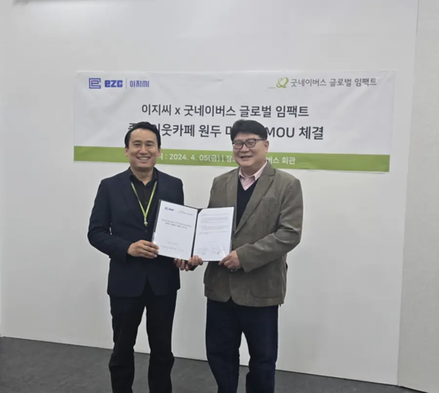 자동판매기 제조전문회사 EZC(대표 이종호)가 굿네이버스 글로벌 임팩트(이사장 정해원, 이하 굿네이버스)와 ‘무인 좋은이웃카페’에 콜라보 마케팅을 펼친다. EZC는 최근 굿네이버스 회관에서 ‘좋은이웃카페 원두 유통 및 마케팅’을 위한 업무협약(MOU)을 굿네이버스와 체결했다고 8일 밝혔다