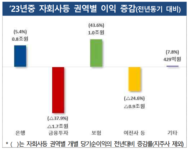 은행 자회사의 작년 당기순이익은 5.4%(7863억원) 증가한 15조4천억원, 보험은 43.6%(1조146억원) 급증한 3조3천억원으로 나타났다. 반면에 금융투자는 37.9%(1조6986억원) 감소한 2조8천억원, 여전사는 24.6%(8902억원) 줄은 2조7천억원을 각각 기록했다.