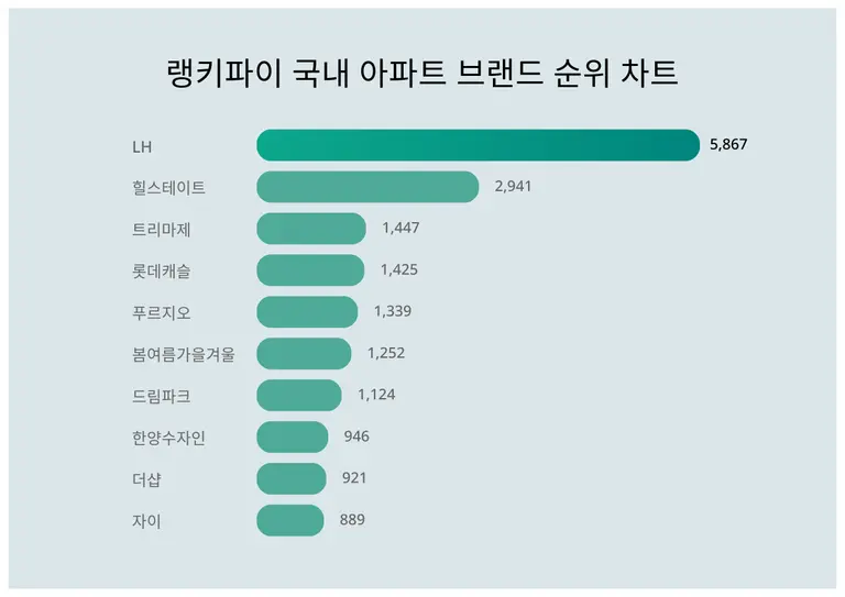 LH가 트렌드 지수 5,867포인트로 랭키파이 4월 2주차 국내 아파트 브랜드 트렌드 지수에서 1위에 올랐다.