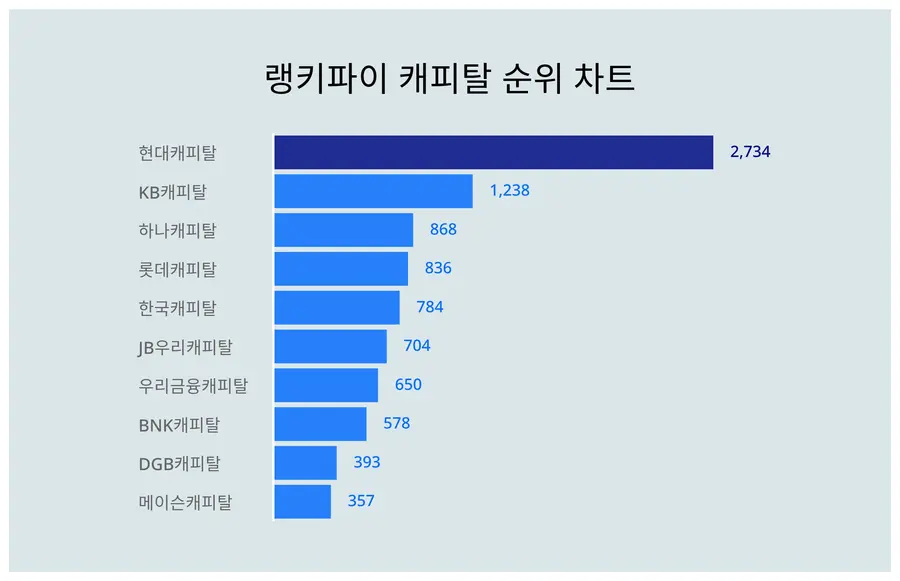 4위 롯데캐피탈은 836포인트, 5위 한국캐피탈은 784포인트, 6위 JB우리캐피탈은 704포인트, 7위 우리금융캐피탈은 650포인트, 8위 BNK캐피탈은 578포인트, 9위 DGB캐피탈은 393포인트, 10위 메이슨캐피탈은 357포인트이다.