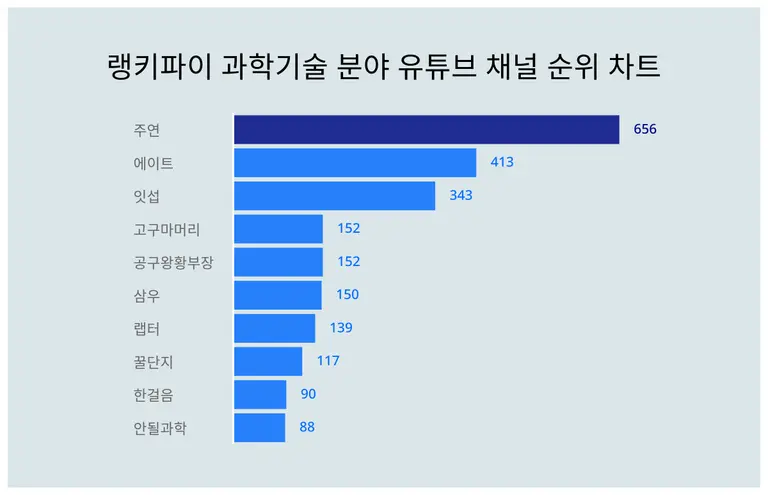 주연이 트렌드 지수 656포인트로 랭키파이 4월 2주차 과학기술 분야 유튜브 채널 트렌드 지수에서 1위에 올랐다.