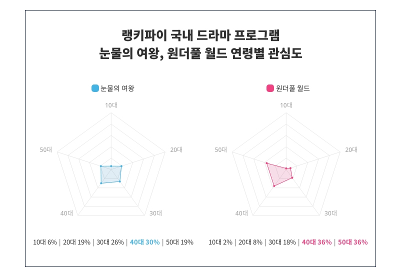 연령별 관심도 조사에서 눈물의 여왕과 원더풀 월드의 관심도가 다양한 연령층 사이에서 어떻게 분포되어 있는지가 명확히 드러났다. 조사 결과, 눈물의 여왕은 특히 40대에서 30%의 높은 관심도를 기록하며 가장 큰 관심을 끌고 있는 것으로 나타났다. 눈물의 여왕의 인기는 10대 6%, 20대 19%, 30대 26%, 40대 30%, 50대 19%순으로 이어지며, 각 연령대별에서 어떤한 관심을 받고 있는이가 조사되었다.