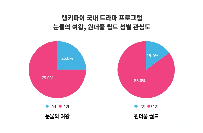 성별 관심도 부문에서 눈물의 여왕의 성별 관심도와 원더풀 월드'의 성별 관심도가 어떻게 분포되어 있는지에 대한 분석이 공개되었다.