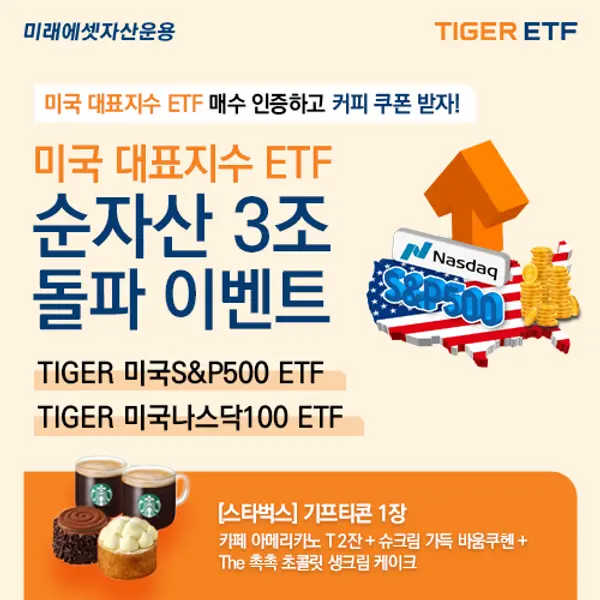 미래에셋자산운용은 ‘TIGER 미국S&P500 ETF’와 ‘TIGER 미국나스닥100 ETF’의 순자산 3조원 돌파를 기념해 고객 이벤트를 진행한다. 오는 26일까지 해당 ETF를 보유 인증한 참여자 중 추첨을 통해 기프티콘을 증정한다. 자세한 이벤트 내용은 TIGER ETF 홈페이지에서 확인할 수 있다.