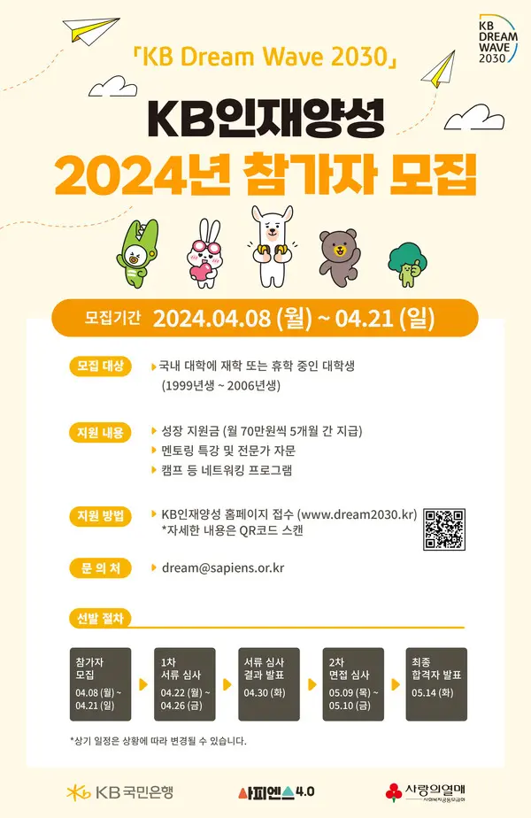 지난 2021년부터 시작한 KB인재양성은 꿈이 있는 청년을 선발해 체계적으로 성장할 수 있도록 지원한다. KB국민은행의 대표 사회공헌사업 KB 드림 웨이브(Dream Wave) 2030의 일환이다.