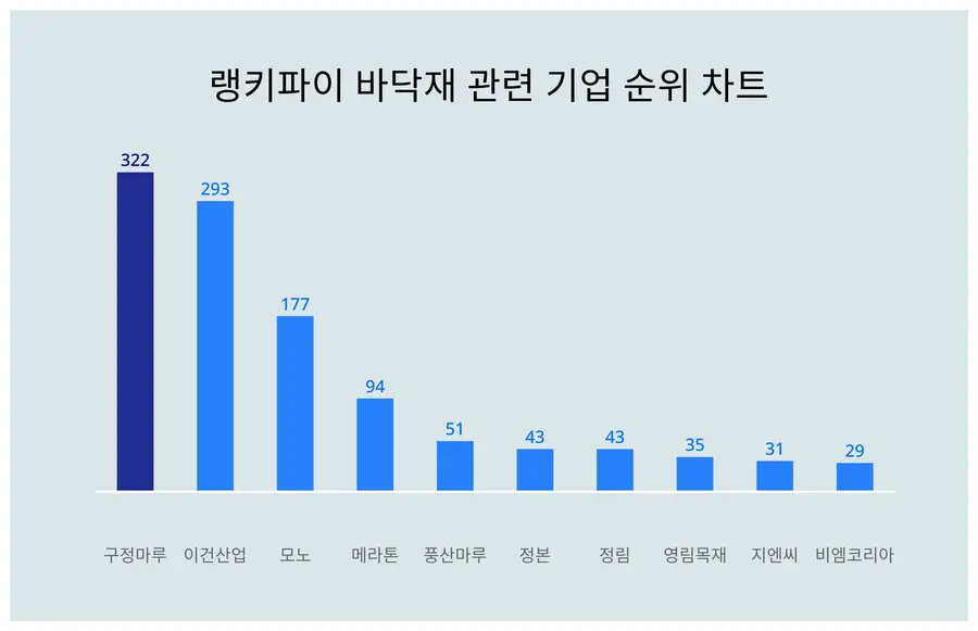 구정마루가 트렌드 지수 322포인트로 랭키파이 4월 3주차 바닥재 관련 기업 트렌드 지수에서 1위에 올랐다.