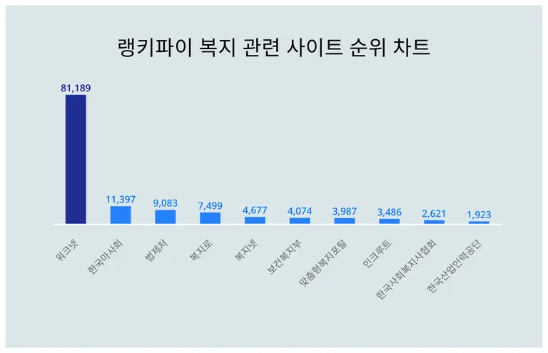 4위 복지로는 7,499포인트, 5위 복지넷은 4,677포인트, 6위 보건복지부는 4,074포인트, 7위 맞춤형복지포탈은 3,987포인트, 8위 인크루트는 3,486포인트, 9위 한국사회복지사협회는 2,621포인트, 10위 한국산업인력공단은 1,923포인트이다.