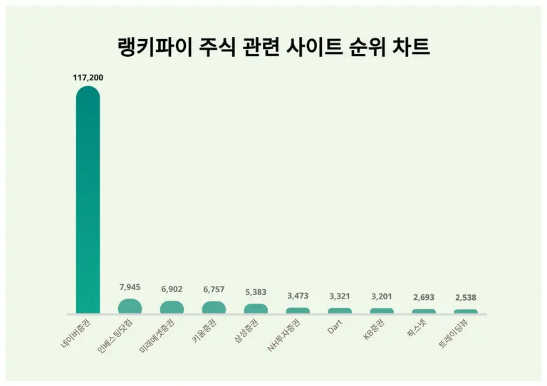 네이버증권이 트렌드 지수 117,200포인트로 랭키파이 4월 3주차 주식 관련 사이트 트렌드 지수에서 1위에 올랐다.