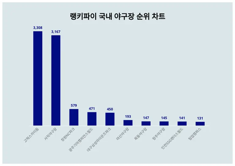 4위 광주기아챔피언스필드는 471포인트, 5위 대구삼성라이온즈파크는 450포인트, 6위 마산야구장은 193포인트, 7위 목동야구장은 147포인트, 8위 청주야구장은 145포인트, 9위 인천SSG랜더스필드는 141포인트, 10위 팀업캠퍼스는 131포인트이다.