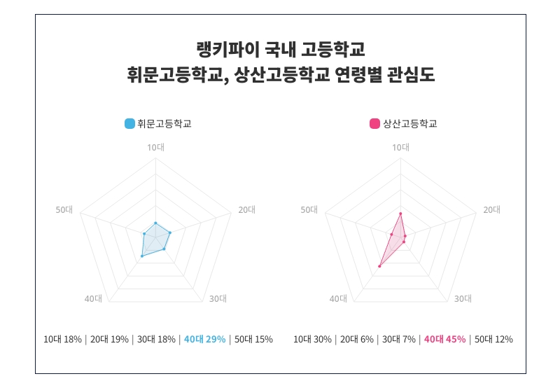 선두자리에 있는 휘문고등학교가 '40대'에서 '29%'로 가장 높은 관심을 보이는 것으로 나타났으며 10대 18%, 20대 19%, 30대 18%, 40대 29%, 50대 15%로 각각의 연령대에서 얼만큼 관심을 받는지 알 수 있다. 또한 뒤를 잇는 상산고등학교가 '40대'에서 '45%'로 가장 많은 지지를 받는 것으로 밝혀졌고, 10대 30%, 20대 6%, 30대 7%, 40대 45%, 50대 12%로 다양한 연령대의 관심을 확인 할 수 있다.