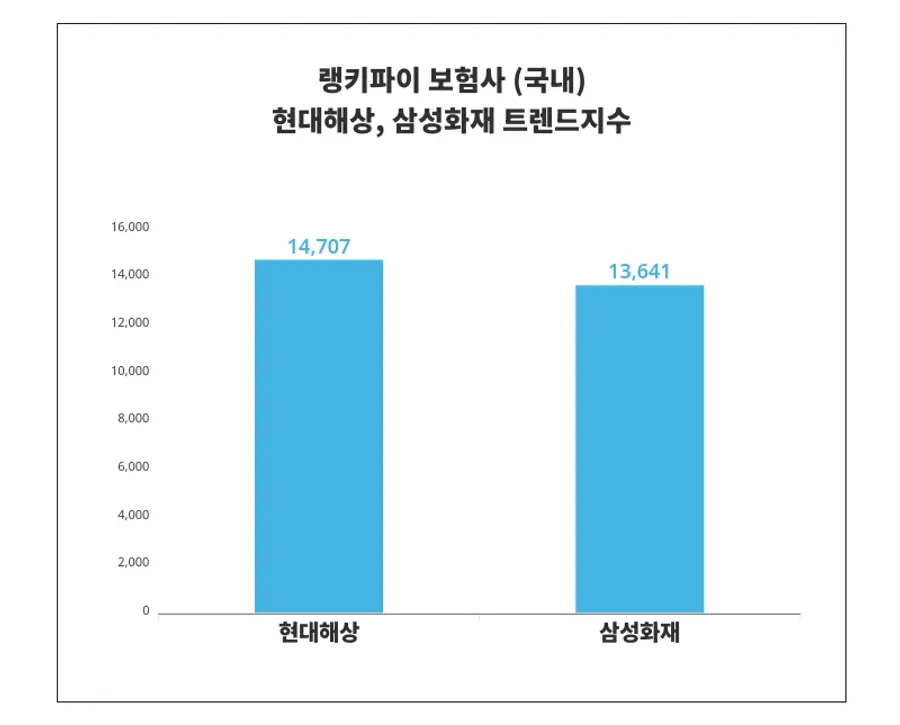 보험사 (국내) 트렌드 지수에서 현대해상은 '14,707포인트'로 삼성화재의 '13,641포인트'보다 '1,066포인트' 차이로 앞서는 것으로 나타났다.