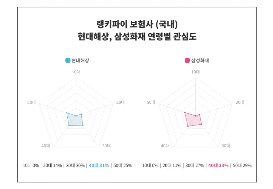 연령별 관심도 부문에서 현대해상의 연령별 관심도와 삼성화재의 연령별 관심도는 위와 같이 나타났다.