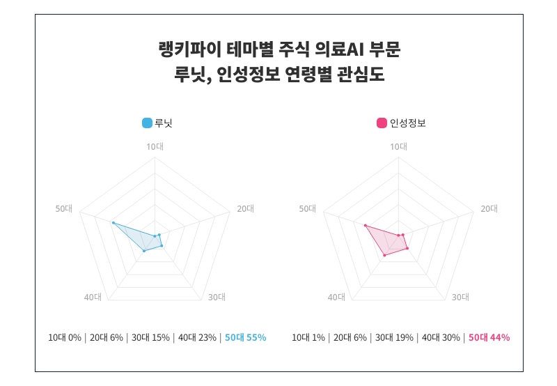 선두자리에 있는 루닛이 '50대'에서 '55%'로 가장 높은 관심을 보이는 것으로 나타났으며 10대 0%, 20대 6%, 30대 15%, 40대 23%, 50대 55%로 각각의 연령대에서 얼만큼 관심을 받는지 알 수 있다. 또한 뒤를 잇는 인성정보가 '50대'에서 '44%'로 가장 많은 지지를 받는 것으로 밝혀졌고, 10대 1%, 20대 6%, 30대 19%, 40대 30%, 50대 44%로 다양한 연령대의 관심을 확인 할 수 있다.