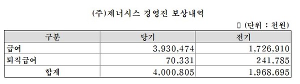 우선, 자회사 BBQ의 고액 배당 전후 지주사 제너시스 경영진보상이 이례적으로 큰 폭 증가했다.