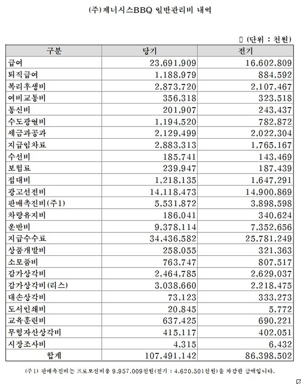 BBQ로부터 천억원대 배당 수입이 있었던 2023 회계년도, 제너시스의 일반관리비 내역을 살펴보면 퇴직급여가 41억5800만원으로 2022년도 10억7천만원 대비 4배로 뛰었다.