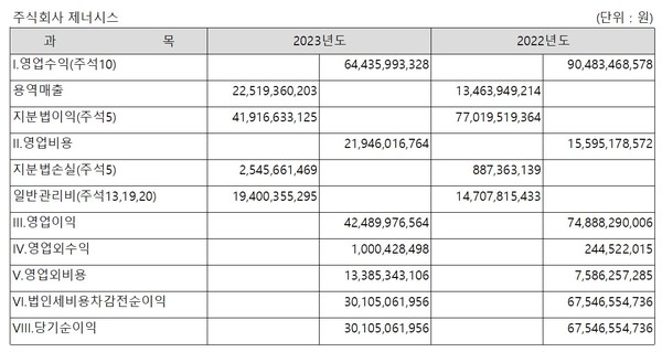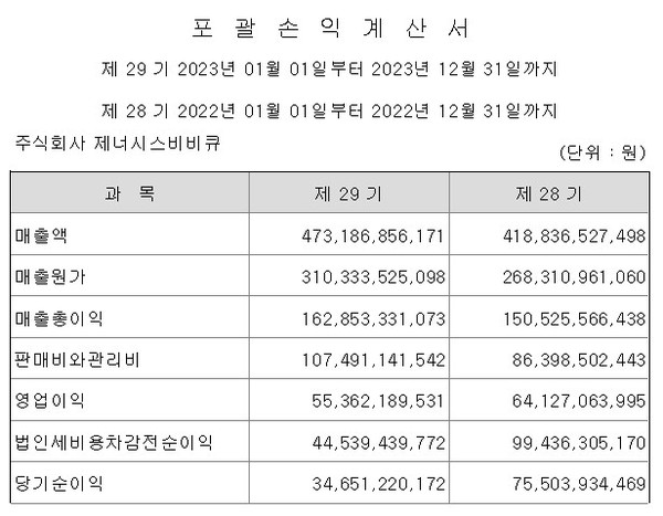 실제 제너시스의 감사보고서상 2023년도와 2022년도 법인세 납부이력은 찾을 수 없다. 손익계산서상 법인세비용 차감전 순익은 당기순이익 값과 동일하다.
