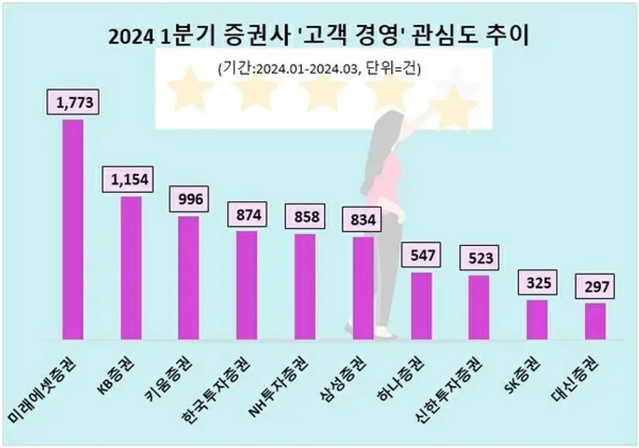 지난 1분기 개인 채널만을 대상으로 증권사의 '고객 경영' 관심도(정보량=포스팅 수)를 조사한 결과 미래에셋증권이 가장 높았다. KB증권과 키움증권이 뒤를 이었다.